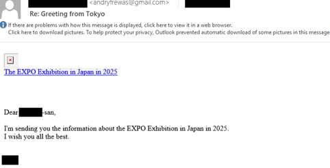 Wiadomość e-mail rozsyłana przez przestępców odnosiła się do wcześniejszej, autentycznej interakcji między atakowanym instytutem dyplomatycznym a japońską organizacją pozarządową. W ten istniejący już wątek korespondencji włączyli się cyberprzestępcy, wykorzystując kontekst nadchodzącego Expo 2025, które odbędzie się w Osace w Japonii. Warto zauważyć, że jeszcze przed atakiem na europejski instytut dyplomatyczny, grupa MirrorFace zaatakowała dwóch pracowników japońskiego instytutu badawczego, wykorzystując złośliwy, zabezpieczony hasłem dokument Word. Nie jest wykluczone, że w ramach tego działania doszło do wycieku danych. Cyberszpiedzy działali konsekwentnie - brak wykonania akcji przez ofiarę skutkował wznowieniem działania – z wyeksponowanym linkiem.